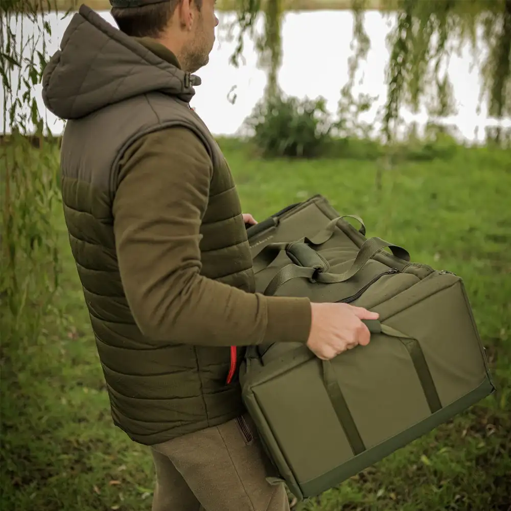 Die Tasche ist innen komplett mit abwischbarem Weich-PVC-Material ausgekleidet, um zu verhindern, dass unerwünschte Köder und Gerüche an ihr haften bleiben. Sie hat große gepolsterte Außentaschen an beiden Seiten um Handgeräte, Ersatzakkus und Ladegeräte zu lagern.